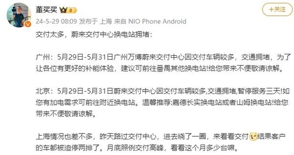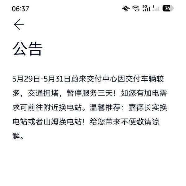比如,在广州:5月29日-5月31日广州万博蔚来交付中心因交付车辆较多,交通拥堵,为了让各位有更好的补能体验,建议可前往番禺其他换电站!给您带来不便敬请谅解。在北京:5月29日-5月31日蔚来交付中心因交付车辆较多,交通拥堵,暂停服务三天!如您有加电需求可前往附近换电站。温馨推荐嘉德长实换电站或者山姆换电站!给您带来不便敬请谅解。