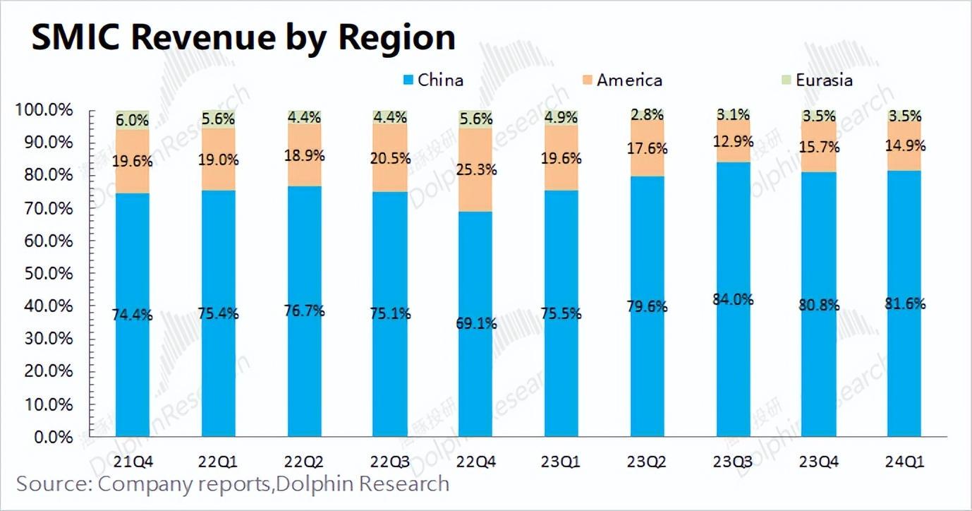 如上图所示,这是中芯自2021Q4以来至2024Q1以来,分地区的营收数据情况,可以看到中芯在中国的营收越来越高,从之前的74.4%,提升至这一季度的81.6%,也就是说超过五分之四的营收,已经在中国市场了。