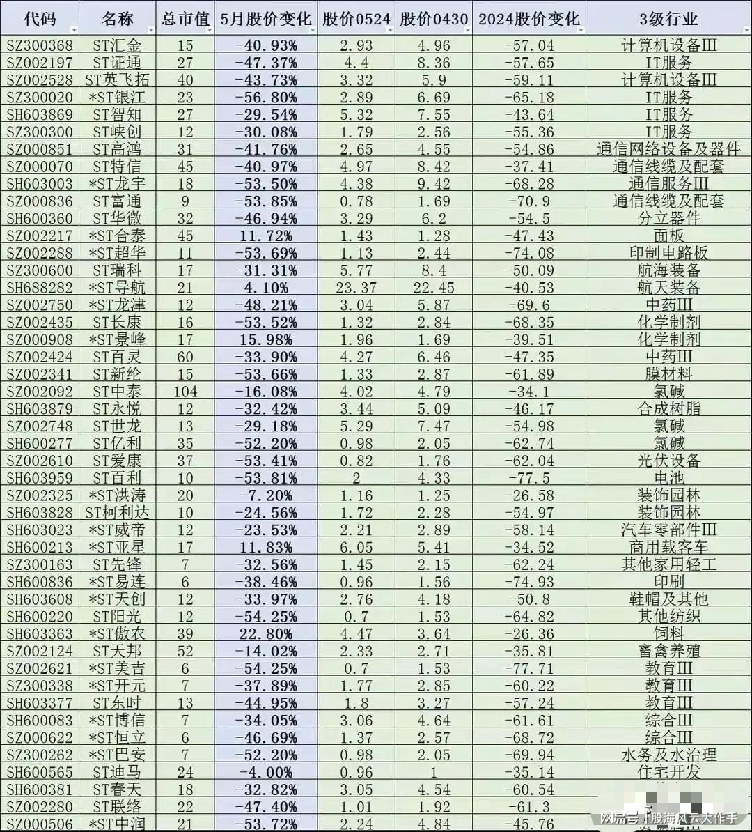 最近村里确实搞得太严了,仅仅5月份就有快五十家公司被ST了。被ST的票起步就是2个跌停板,最猛的ST中润被ST后已经连续19个跌停板。最近ST公司太多,搞得大家都不敢放心买股票,担心一不小心就被ST了,最近股市都走弱了。